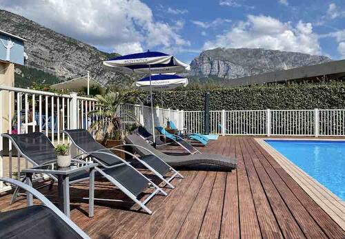 Hotel Le Néron is on the east side of the Isère River in Fontanil-Cornillon, just to the north of Grenoble – and not far from La Belle Via bike route, which links Valence to Chambery and Annecy. The hotel is registered as an accueil velo hotel. It's part of the Logis group of locally owned and operated hotels, meaning it also has an inhouse restaurant serving local cuisine. Outdoor pool and sun terrace. Bar for drinks and snacks. Free, secure car park. A range of room options - doubles/twins, triples and quads, plus two-bedroom self-catered apartments. Some rooms/apartments can sleep up to 10 people, making this hotel ideal for groups of all sizes. The hotel might look a a bit drab on the outside but the rooms are clean, the food is good and there are mountain views from some of the rooms as well as from the restaurant, bar and pool terrace.