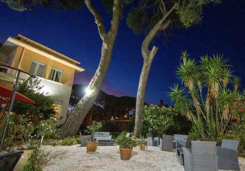 Logis Hôtel le Ceinturon in Hyères is a small hotel with just 15 rooms. It's a charming affair in shaded, flowery grounds just 50m from the beach at Hyères. Opposite the islands of Porquerolles, Port-Cros and Le Levant. There is an in-house restaurant serving local fish specialities, plus a terrace. Bar with cold drinks and ice-cream. 5 of the rooms open onto the terrace with sea views. Doubles, triples, quadruples and quins – good for groups. Nice option if you're cycling between Toulon and Nice.